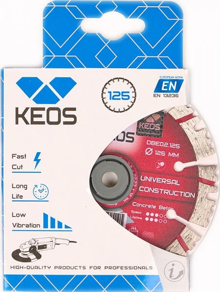 Диск алмазный сегментный Keos Universal Construction 125 мм (Кеос Констракшен 125 мм) предназначен для резки бетона, железобетона и кирпича на ушм (болгарках), штроборезах и системах резки крупноформатной плитки, как с подачей воды, так и всухую.