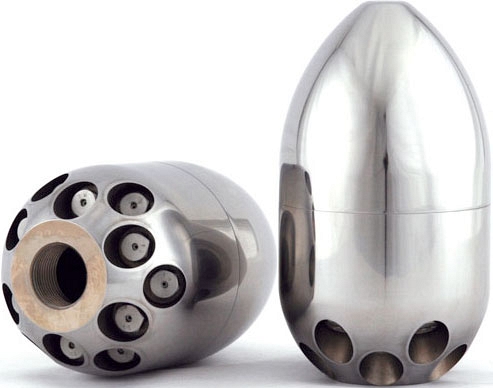 - Оптимизированная система "3D Гидромеханикс": насадки для очистки канализационных сетей были разработаны с использованием оптимизированного "3D Гидромеханизма" – вода, выходящая из шланга высокого давления, плавно поворачивается на 180º, поступает во внутреннюю полость насадки и направляется непосредственно в керамические сопла по пяти осевым каналам (отшлифованных и с высокой точностью обработанных на станке типа CNC), а не трубок или желобов